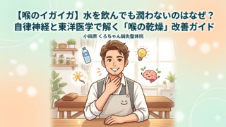 水を飲んでも喉の乾燥・イガイガが取れない原因は自律神経の乱れかも。小田原市のくろちゃん鍼灸整体院では、骨盤矯正や鍼灸、頭部施術で喉の不快感へアプローチ。南足柄市や秦野市からも来院多数。24時間LINE予約受付中。体調が悪くて休まない体作りをサポートします!【効果には個人差あり】