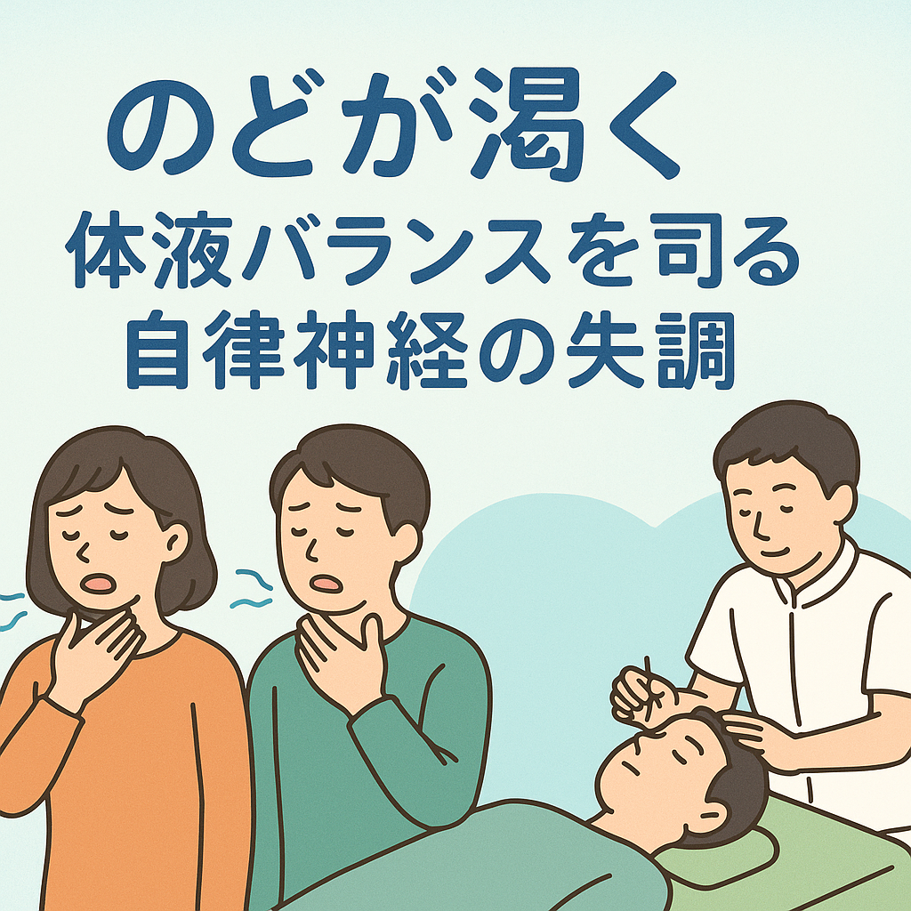 のどの渇きは体からの大切なサイン。今回は 「のどが渇く 体液バランスを司る自律神経の失調」 というテーマで、自律神経と東洋医学の両面から詳しく解説し、当院で行う骨盤矯正・猫背矯正・鍼灸施術・頭部施術がどのように改善に役立つかをお伝えします。
