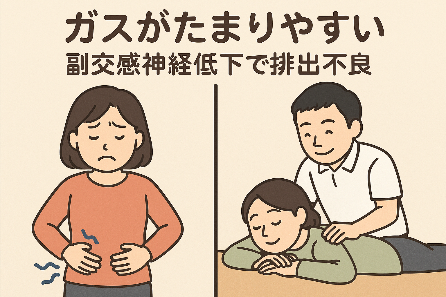 一見、食べすぎや消化の問題に思えるかもしれませんが、実はその背景には“副交感神経の働きの低下”が関係していることがあります。副交感神経が弱まると、腸のぜん動運動やガスの排出機能が低下し、溜まりやすくなるのです。