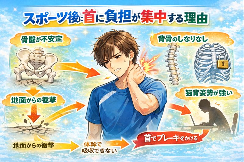 ではなぜ、スポーツ後に首が張るのでしょうか。