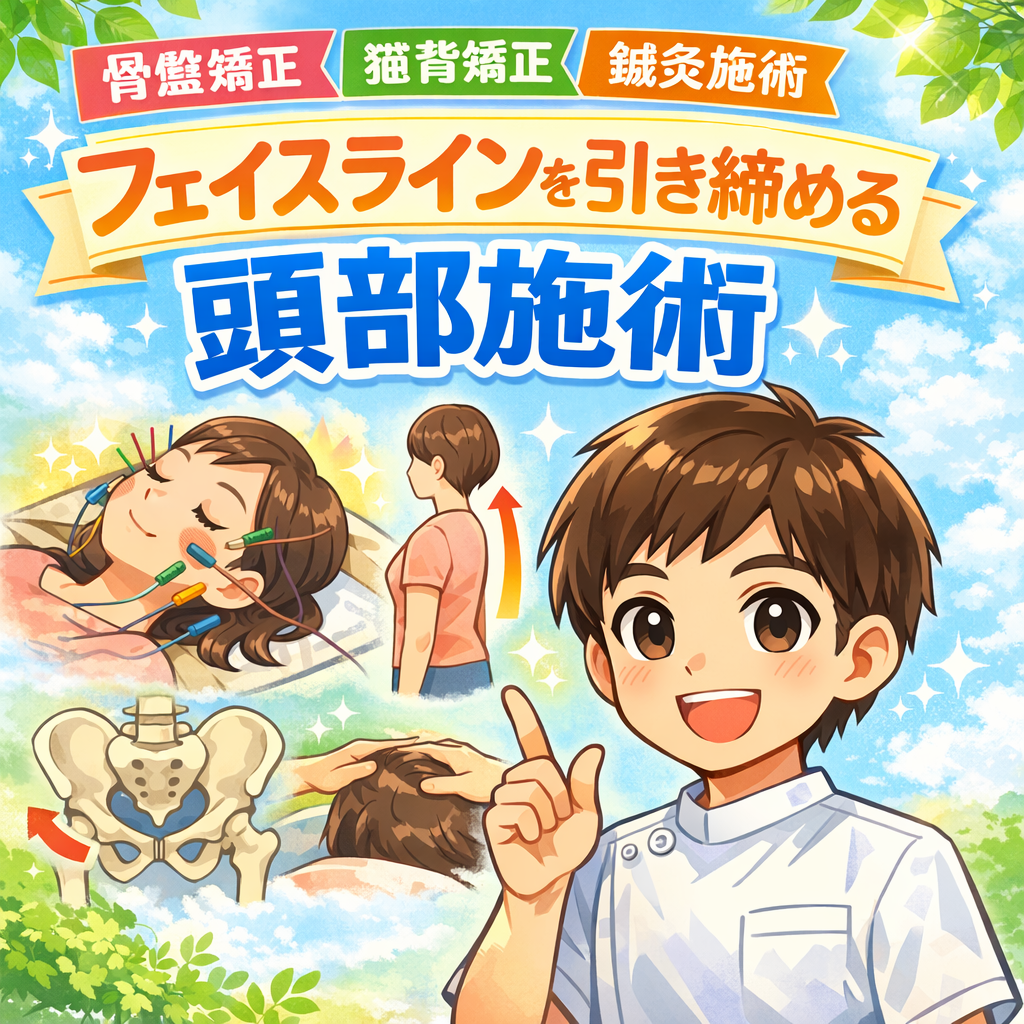 頭部施術を中心に、骨盤矯正・猫背矯正・鍼灸施術を組み合わせて全身から整えることで、フェイスラインを引き締めていきます。