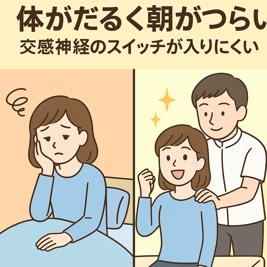 交感神経の幹は背骨に沿って走っており、骨盤や腰椎の歪みがあると神経伝達が滞り、朝の自律神経スイッチが入りにくくなります。
