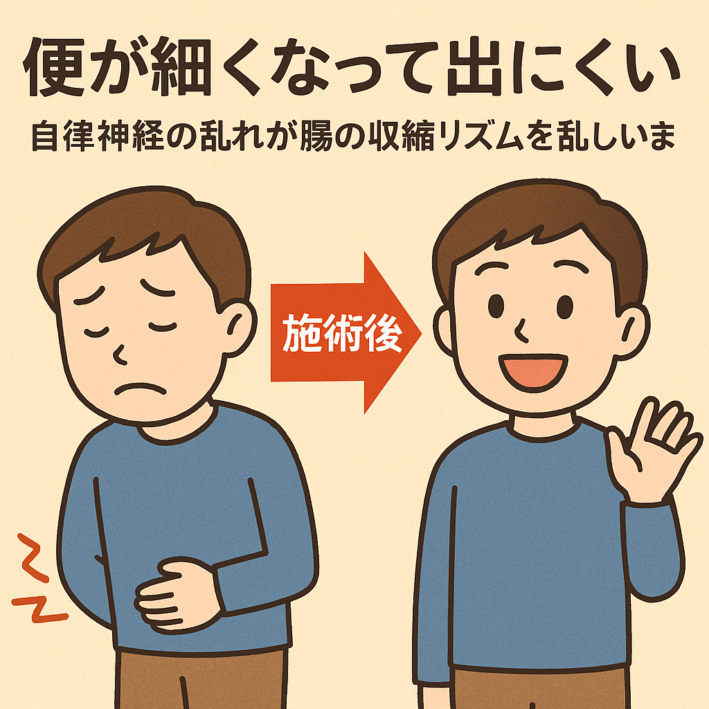 特に、ストレスが多い方・デスクワークが中心の方・猫背や骨盤の歪みがある方では、腸の位置や神経の働きが乱れやすく、便が「細く」「硬く」「出づらい」状態を引き起こします。