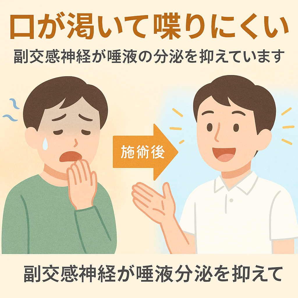 これらを組み合わせて施術することで、唾液分泌がスムーズになり、喉や口の乾燥感がやわらぎます。