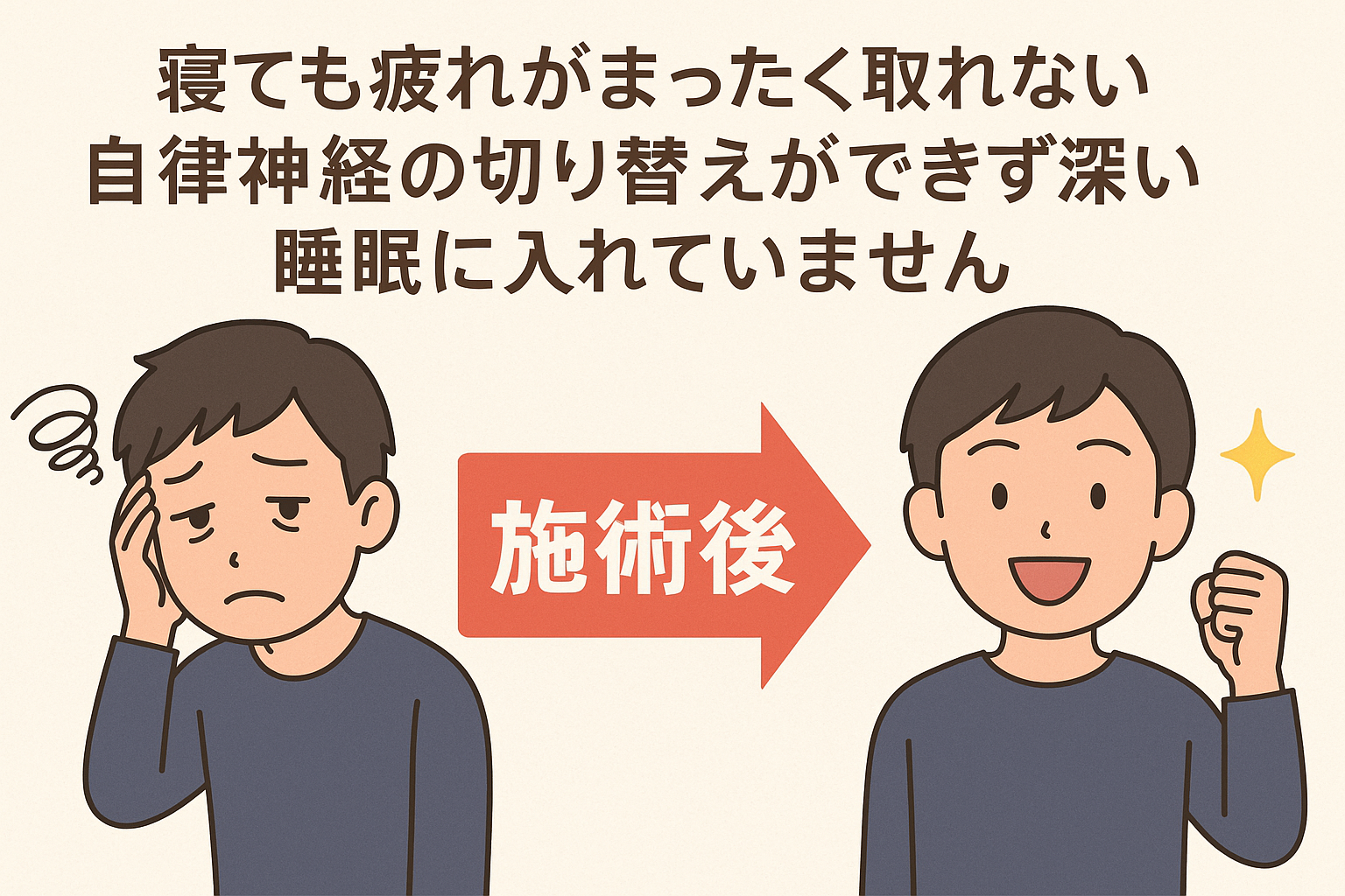 この記事では、「寝ても疲れが取れない」状態がどうして起こるのか、自律神経の働きや東洋医学の視点から詳しく解説し、実際に当院で行っている骨盤矯正・猫背矯正・鍼灸施術・頭部施術がどのように効果を発揮するのかをわかりやすくお伝えします。