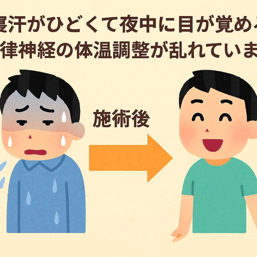 猫背矯正で胸郭の動きを回復させると、深い呼吸が入りやすくなり、自律神経の切り替えがスムーズになります。夜に「副交感神経が優位な状態」に入りやすくなり、寝汗も徐々に落ち着いていきます。