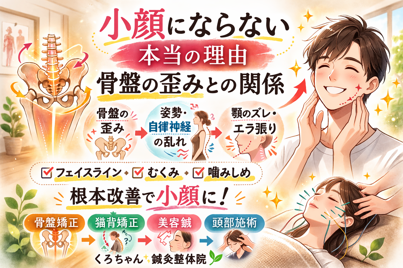 骨盤の歪み → 背骨の硬さ → 自律神経の乱れ → 噛みしめ → エラ肥大