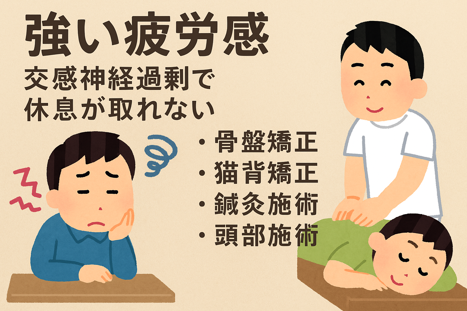 この記事では、自律神経の仕組みと東洋医学的な見方を交えながら、なぜ強い疲労感が起こるのかを解説します。そして、当院で行っている骨盤矯正・猫背矯正・鍼灸施術・頭部施術がどのように疲労感改善に役立つのかを、具体的にお伝えいたします。