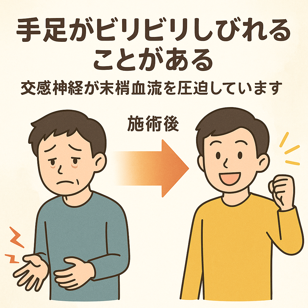 手足のしびれは、ただの神経トラブルではありません。交感神経が末梢の血管を圧迫し、血流と神経伝達が滞っているサインです。現代人の生活習慣やストレス環境では、このタイプのしびれが非常に多く見られます。