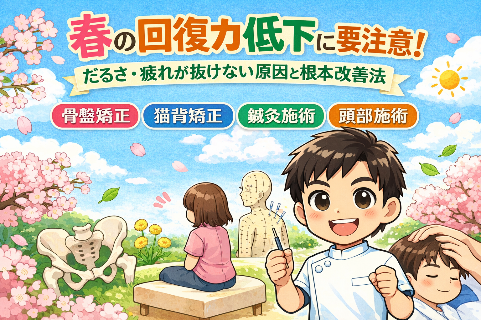 くろちゃん鍼灸整体院では、骨盤矯正・猫背矯正・鍼灸施術・頭部施術を組み合わせた、あなたに合ったオーダーメイドの施術で、春の回復力低下に総合的にアプローチします。