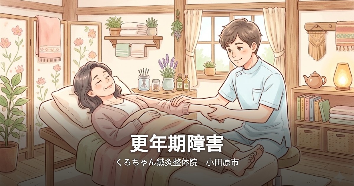 この記事では、更年期の不調の原因を自律神経と東洋医学の両面から丁寧に解説し、くろちゃん鍼灸整体院でできる施術アプローチをお伝えします。小田原市・南足柄市・開成町・秦野市・中井町・大井松田町エリアで自律神経の不調にお悩みの方に向けた内容です。