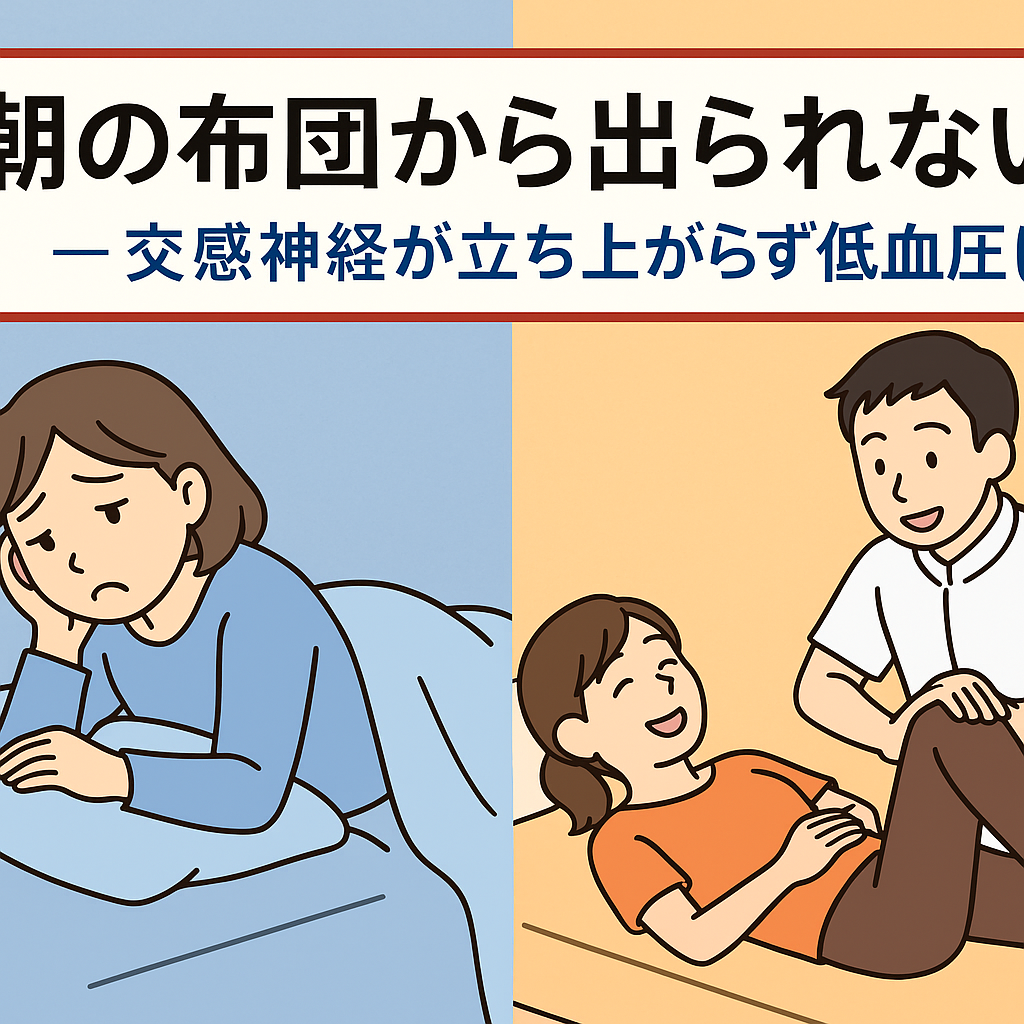 本記事では「朝の布団から出られない ― 交感神経が立ち上がらず低血圧に」というテーマで、自律神経のメカニズム、東洋医学的な考え方、さらに当院の施術(骨盤矯正・猫背矯正・鍼灸施術・頭部施術)がどのように役立つのかを、分かりやすく解説していきます。