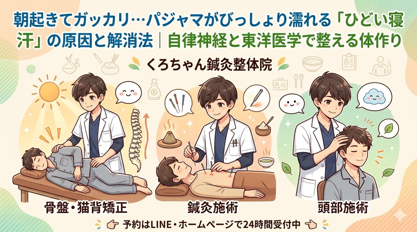 実は、当院「くろちゃん鍼灸整体院」にも、あなたと同じように**「異常なほどの寝汗」**で悩んで来院される方がたくさんいらっしゃいます。