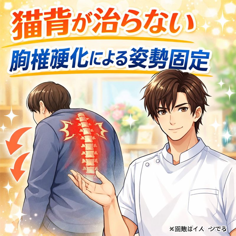 胸椎(背中の骨)が硬くなり、姿勢が“固定”されてしまっている状態です。