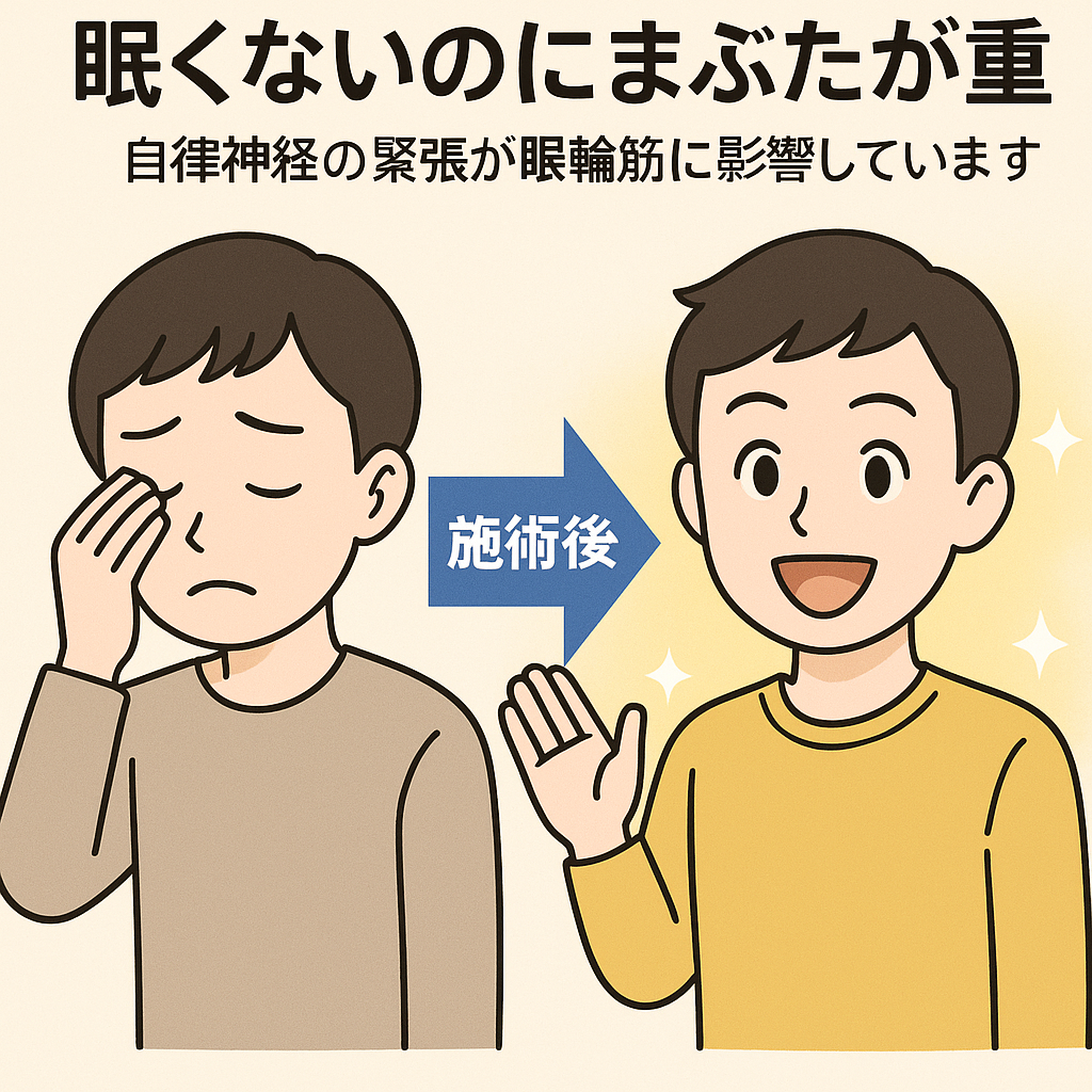 まぶたが重くなるのは、単なる疲れ目ではなく、自律神経の緊張が続いて目のまわりの筋肉(眼輪筋)や眼球を支える筋肉がこわばっているサインです。