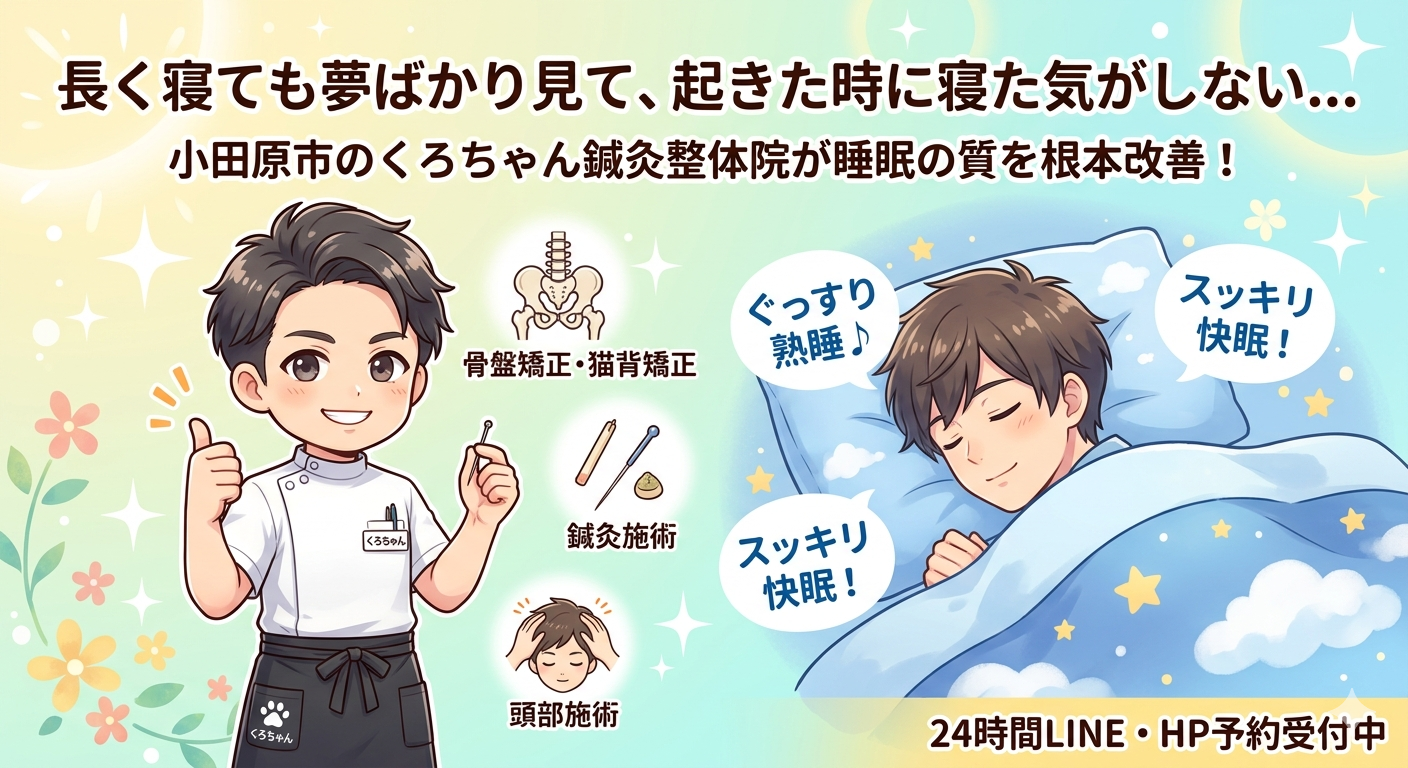 小田原市のくろちゃん鍼灸整体院です。当院には、こうした「睡眠の質」に関するお悩みを持つ方がたくさん来院されます。