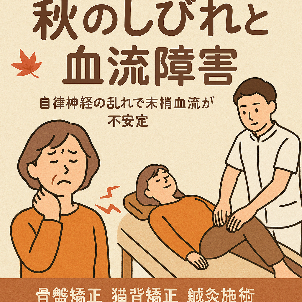 この記事では、秋特有のしびれや血流の不安定さがなぜ起こるのかを、自律神経の観点と東洋医学の観点からわかりやすくお伝えします。そして、当院で行っている骨盤矯正・猫背矯正・鍼灸施術・頭部施術がどのように血流を改善し、しびれの症状を和らげるのかを詳しくご紹介していきます。