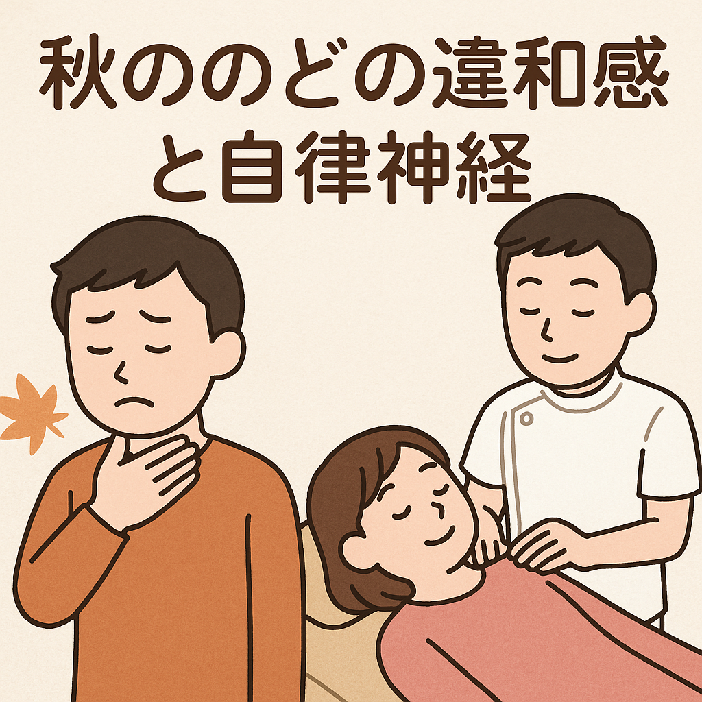 特に、季節の変わり目の秋は、昼夜の気温差や湿度の変化、仕事や生活リズムの調整などで交感神経が過剰に働きやすく、その結果、咽頭の筋肉がこわばって「のどの違和感」として表れることがあります。