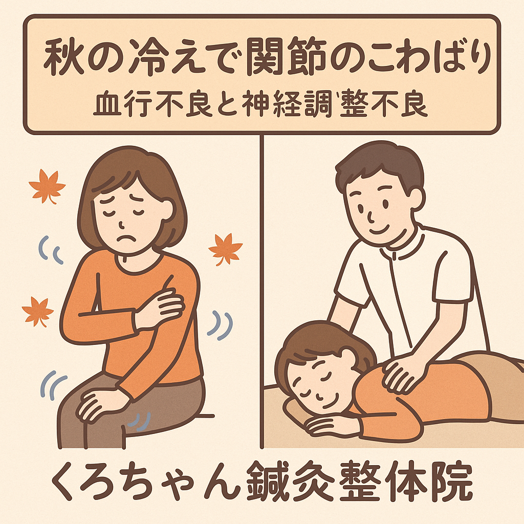 秋になると「冷えると関節がこわばって動きづらい」「朝起きた時に関節がスムーズに動かない」という声を多くいただきます。夏の暑さが和らいだあと、急に冷え込みが強くなる秋口は、自律神経が温度差にうまく対応できず、血流や神経の働きに影響が出やすい季節です。その結果、関節周囲の筋肉や血管が収縮して硬さや痛み、しびれにつながることがあります。この記事では「秋の冷えで関節がこわばる原因」と「東洋医学的な考え方」、さらに当院で行っている施術(骨盤矯正・猫背矯正・鍼灸施術・頭部施術)がどのように効果を発揮するのかを詳しくご紹介します。