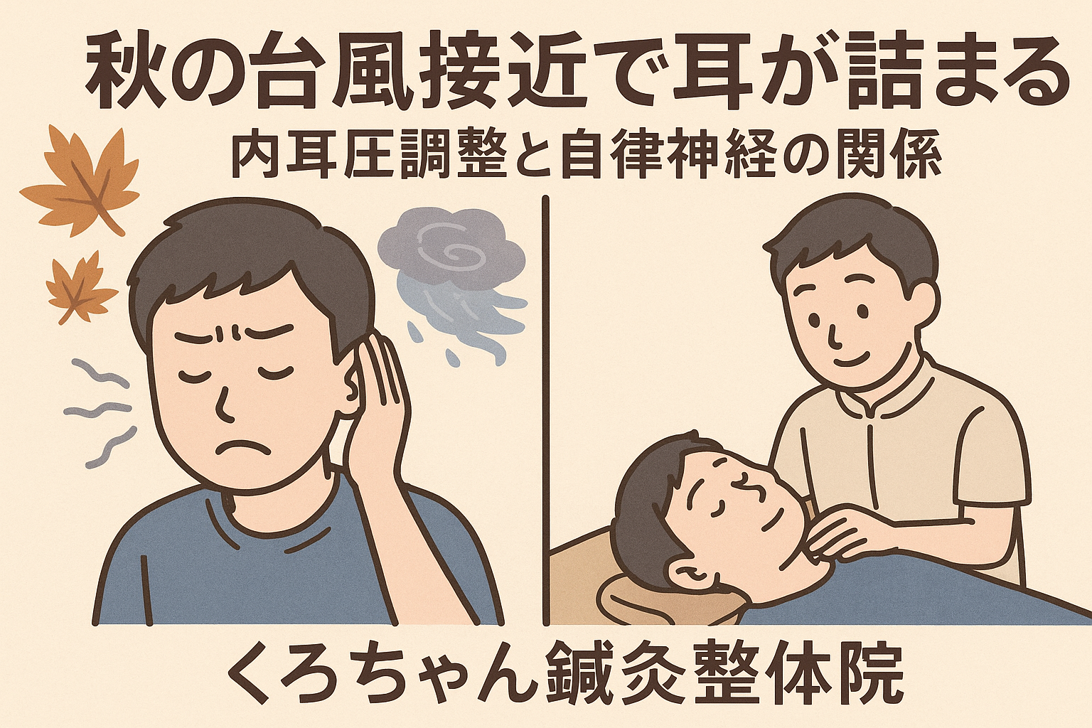 秋の台風接近で起こる「耳の詰まり感」は、内耳の圧調整と自律神経のバランスが大きく関係しています。骨盤矯正・猫背矯正・鍼灸・頭部施術を組み合わせることで、根本から改善と予防を目指すことができます。