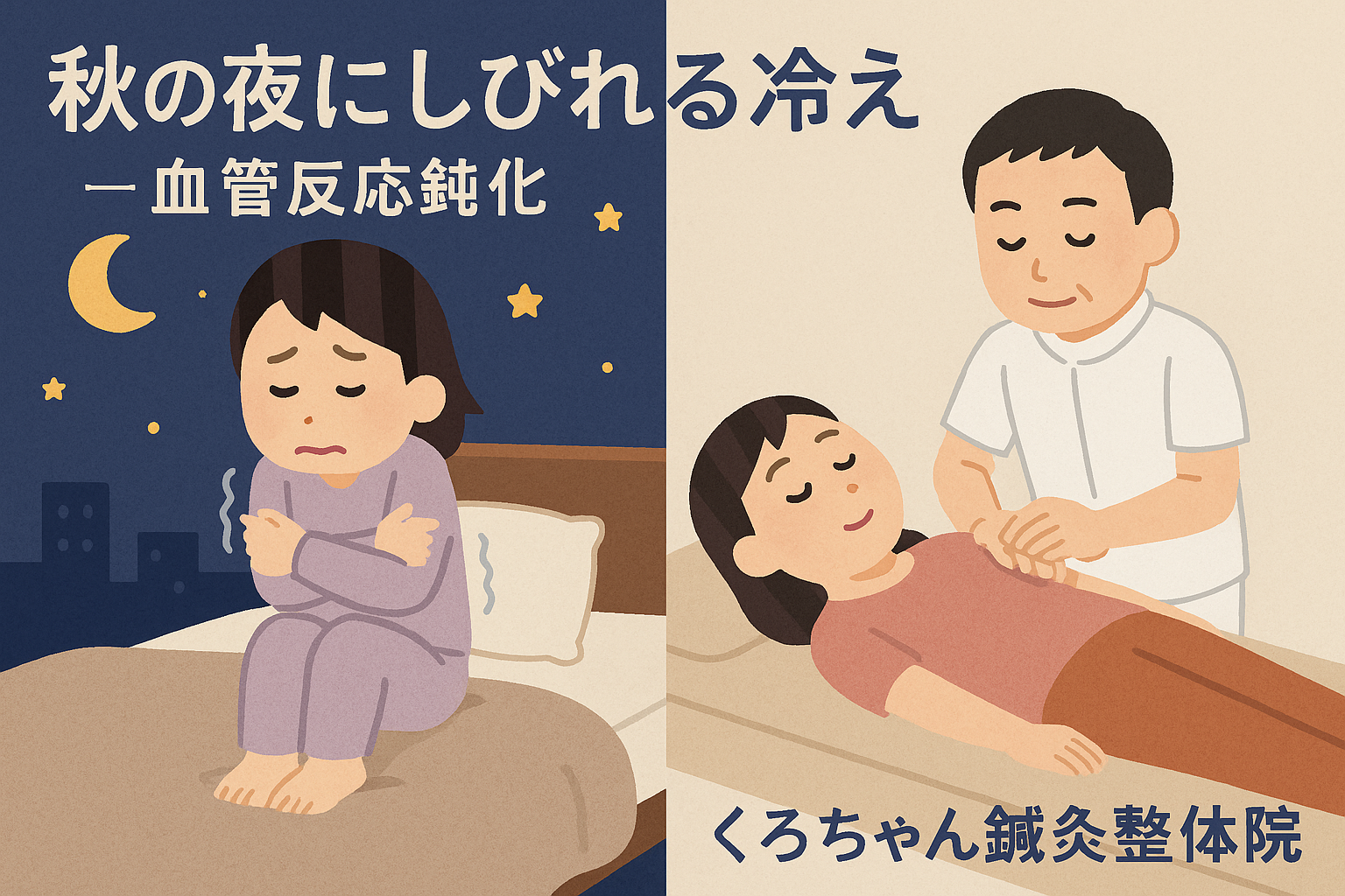 秋の夜、気温がぐっと下がると「手足がしびれるように冷たい」と感じる方が増えてきます。寝る前に靴下を履いても温まらない、布団に入っても指先がピリピリと痛むような感覚――。これは単なる冷え性ではなく、「血管反応の鈍化」と「自律神経の乱れ」によって起こる現象です。