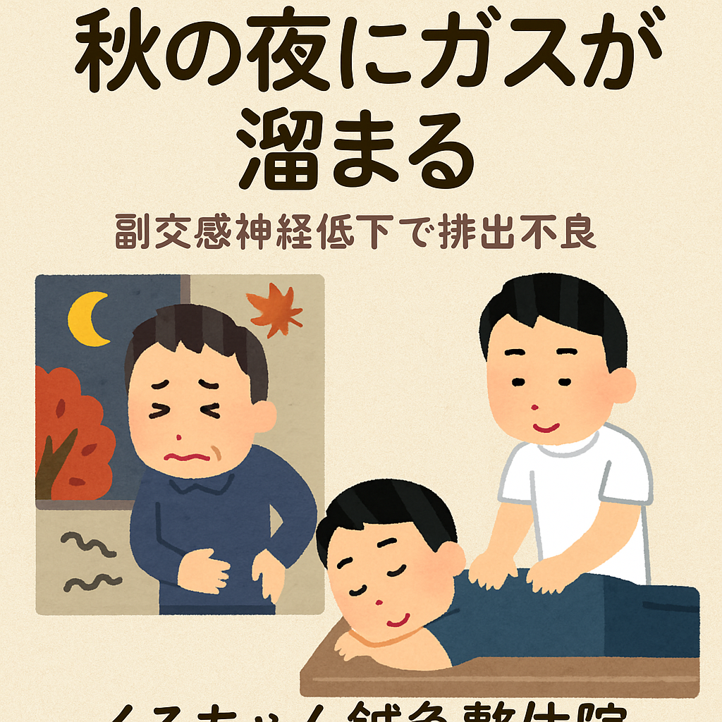 秋の夜にガスが溜まるのは、単なる消化不良ではなく「副交感神経の低下」による排出機能の不良が関係しています。骨盤の歪みや姿勢の乱れ、ストレスによる肝脾のバランス低下も影響します。
