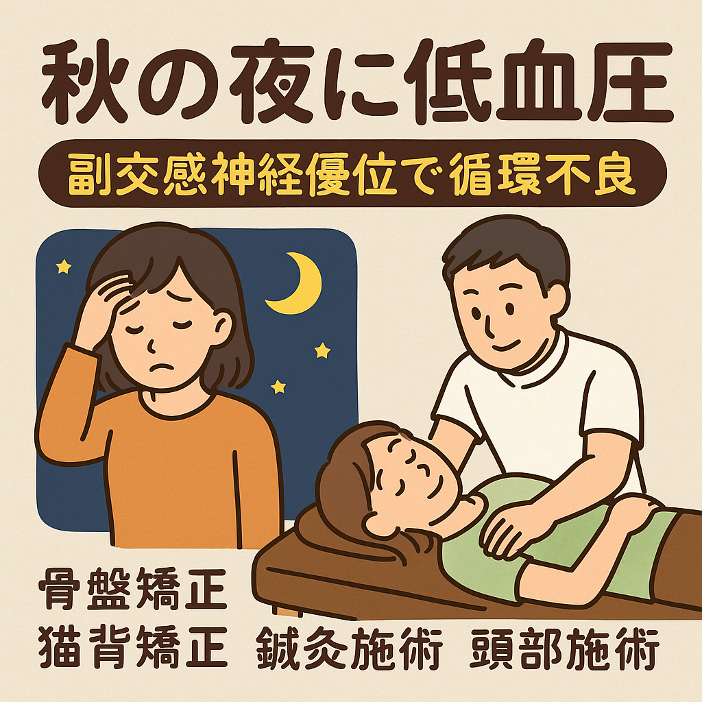 特に、秋の夜の気温低下は血管を収縮させ、血流が末端まで届きにくくなるため、「副交感神経の過剰反応+血行不良=低血圧体質の悪化」という状態が起こりやすいのです。