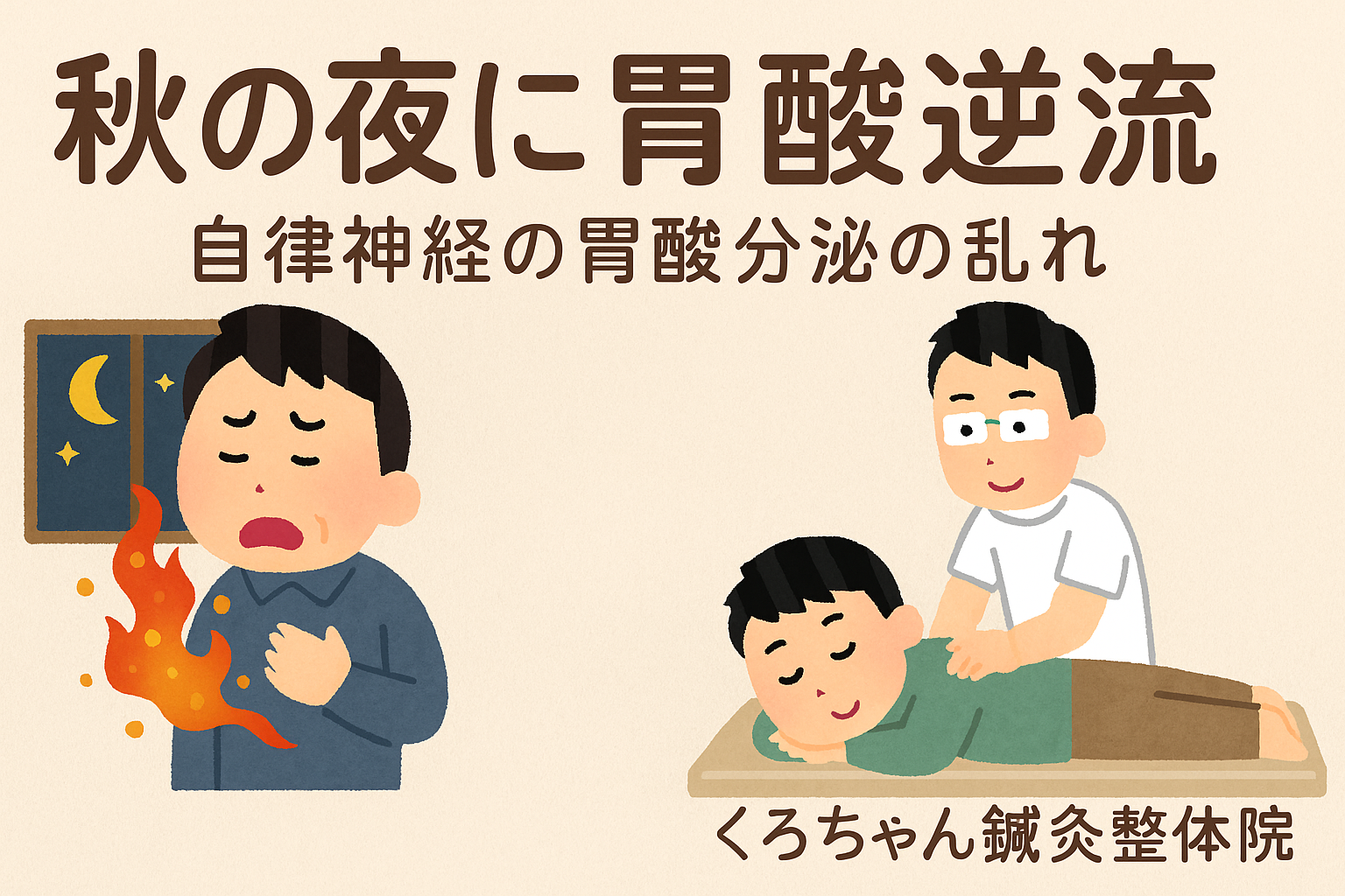 本記事では、秋の夜に多い「胃酸逆流」をテーマに、自律神経と東洋医学の両面から解説し、くろちゃん鍼灸整体院で行っている 骨盤矯正・猫背矯正・鍼灸施術・頭部施術 がどのように改善につながるのかを詳しくご紹介します。