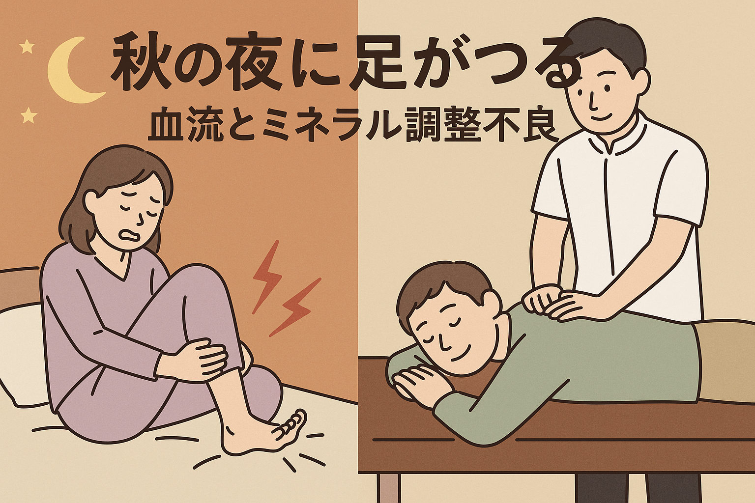 「急にふくらはぎがつって目が覚めた」「夜になると足がピクピクする」そんな声が秋口になると増えてきます。昼と夜の寒暖差が大きくなり、血流や自律神経のバランスが乱れやすいこの季節。体の中の“巡り”が滞ることで、筋肉がこわばりやすくなってしまうのです。