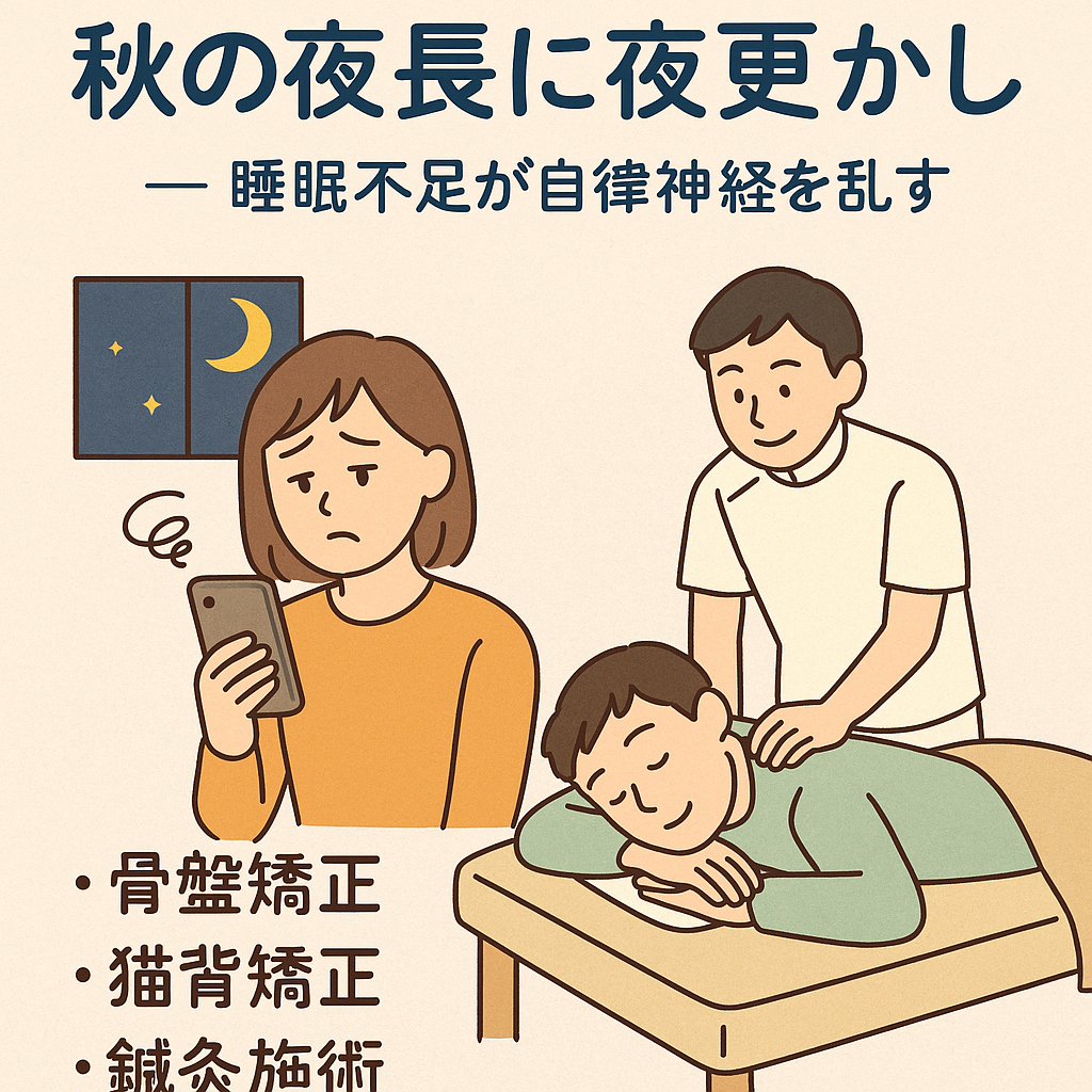 実は「秋の夜長の夜更かし」は、ただの寝不足では終わらず、自律神経のバランスを大きく崩す原因になるのです。本記事では、自律神経の仕組みと東洋医学的な視点から、なぜ睡眠不足が心身に影響するのかを解説し、当院の施術(骨盤矯正・猫背矯正・鍼灸施術・頭部施術)がどのように役立つのかをお伝えしていきます。