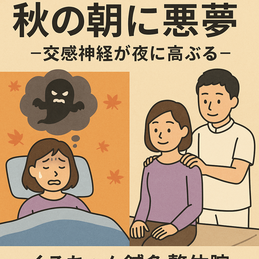 秋の朝に悪夢を見てしまうのは「夜に交感神経が高ぶる」ことが大きな原因です。東洋医学的には心と肝の不調が背景にあり、施術で整えていくことが可能です。骨盤矯正・猫背矯正・鍼灸施術・頭部施術を組み合わせることで、より深い眠りと安定した自律神経を取り戻せます。