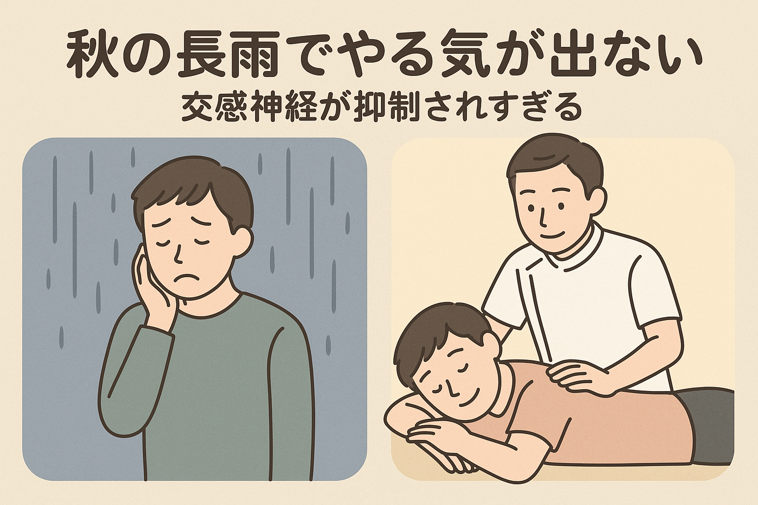 秋の長雨によるやる気の低下は「交感神経の抑制」と「湿邪の停滞」が重なって起こるものです。骨盤矯正・猫背矯正・鍼灸施術・頭部施術を組み合わせることで、自律神経のバランスを整え、心身のやる気スイッチを取り戻すことができます。