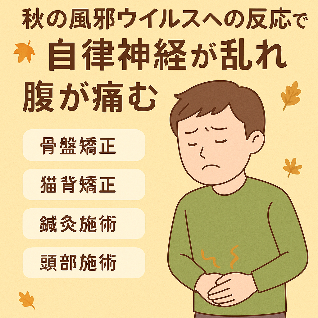 秋が深まってくると、気温の低下や朝晩の冷え込みに加えて、風邪やウイルスが流行し始める季節です。そんな中、「風邪をひいたわけでもないのに、お腹が痛い」「なんとなくお腹がキリキリする」「胃腸の動きが鈍く、下痢や便秘を繰り返す」といった不調を訴える方が増えてきます。実はこれ、風邪ウイルスへの免疫反応によって自律神経が乱れ、内臓の働きが不安定になっているサインかもしれません。