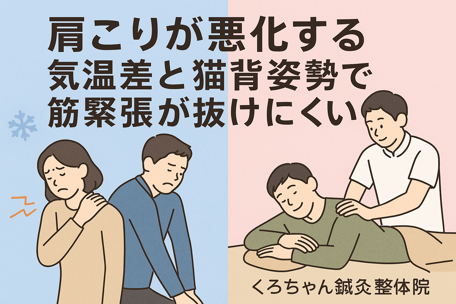そんな声を患者さんからよくいただきます。特に秋から冬、冬から春への移行期など、気温差が大きい時期と猫背の姿勢習慣が重なると、肩や首の筋肉はガチガチに固まりやすくなります。