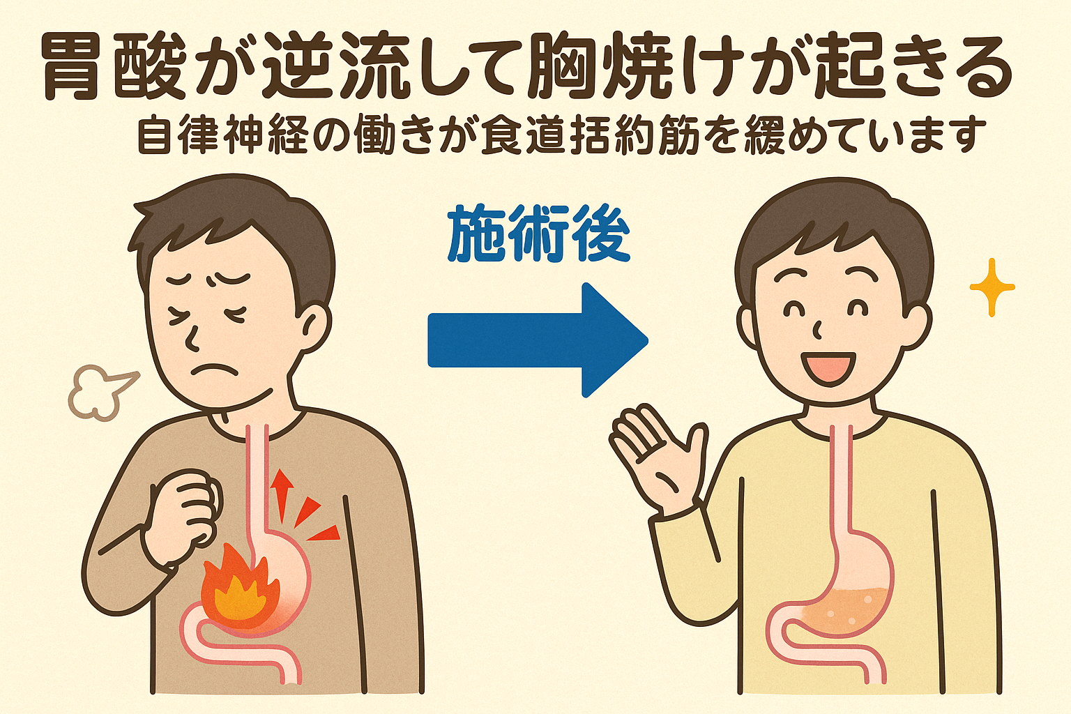 ストレスや姿勢の悪化、睡眠不足などで自律神経のバランスが崩れると、胃酸の分泌量や食道括約筋(胃と食道の境目にある筋肉)の働きが乱れ、胃酸が逆流しやすくなるのです。