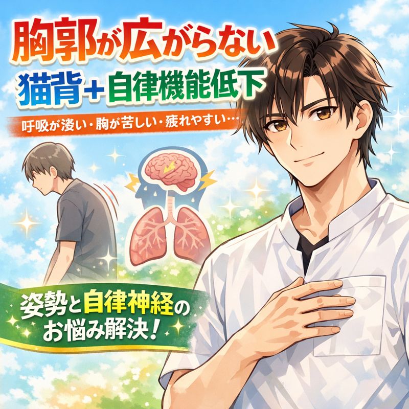 そう思って我慢している方も多いですが、実は猫背と自律機能低下が重なることで、胸郭はどんどん動かなくなっていくのです。
