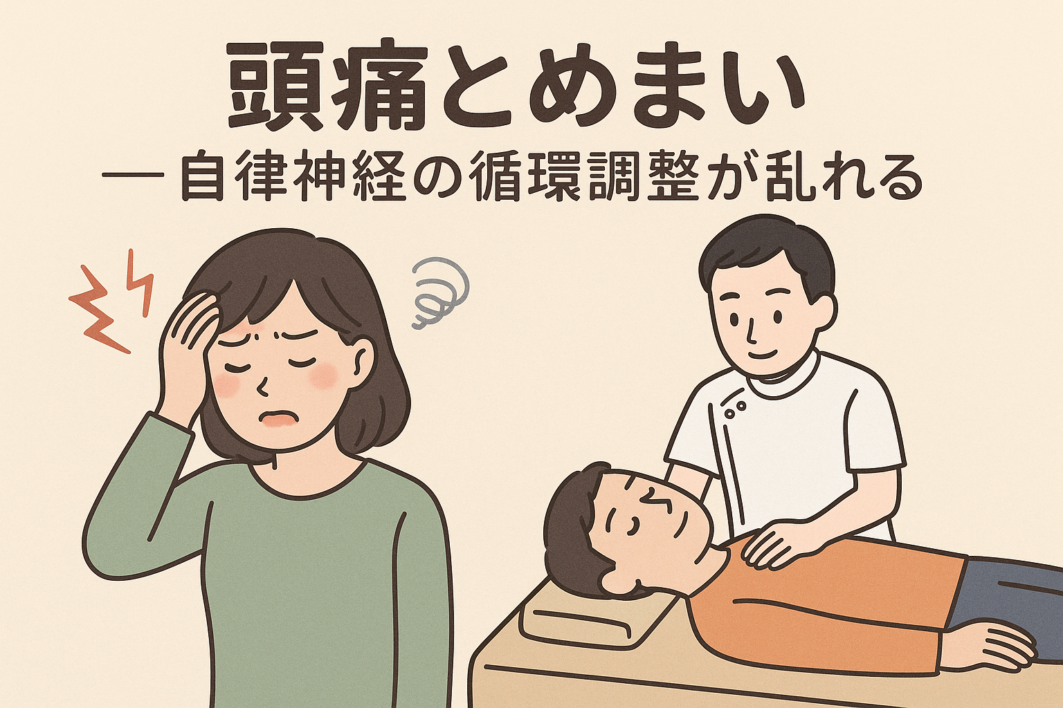 頭痛とめまい。この2つの症状が同時に起こると、とてもつらいですよね。「頭が重い」「ぐるぐる回る感じがする」「立ち上がるとふらつく」──そんな声をよく耳にします。実はこれ、自律神経の循環調整がうまく働いていないことが大きく関係しています。
