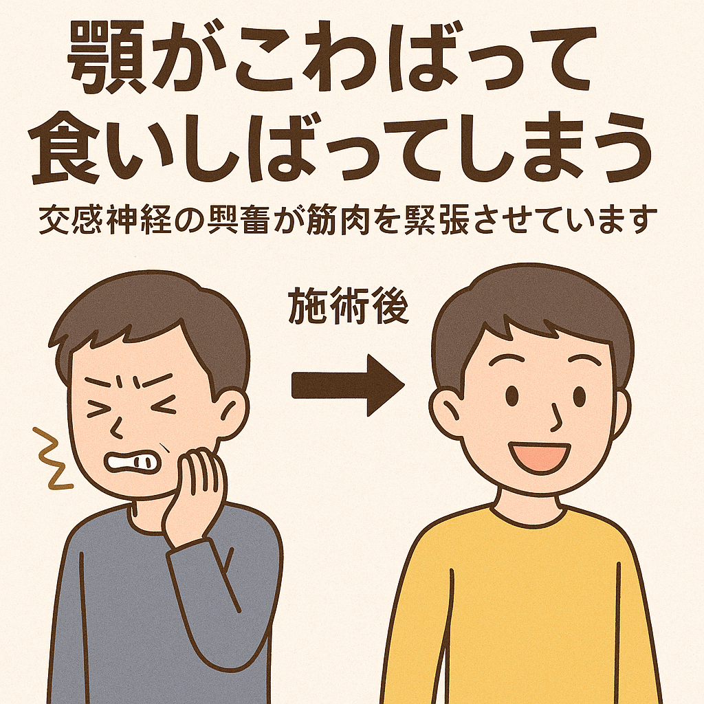 日中の仕事・人間関係・環境の変化などによって交感神経が過剰に働くと、体は「戦闘態勢」になり、筋肉は常に収縮・緊張しやすい状態になります。顎も例外ではありません。噛む筋肉(咬筋・側頭筋など)はストレスの影響を受けやすく、交感神経の興奮状態が続くと、寝ている間や仕事中など無意識のうちに「ぐっと食いしばる」ようになります。