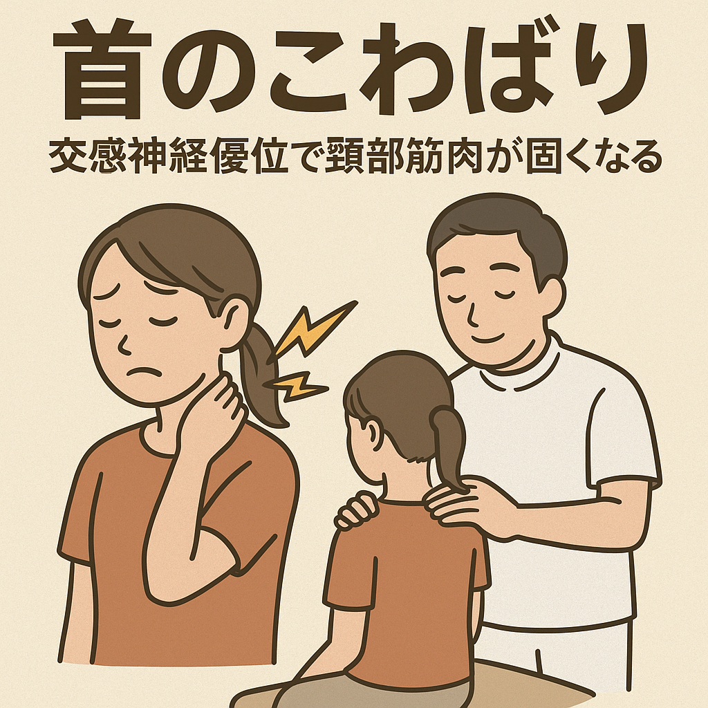 首のこわばりは単なる疲れではなく、自律神経の乱れが背景にあることが多く、とくに交感神経が優位に働くことで首の筋肉が過度に緊張し、症状が長引いてしまうのです。