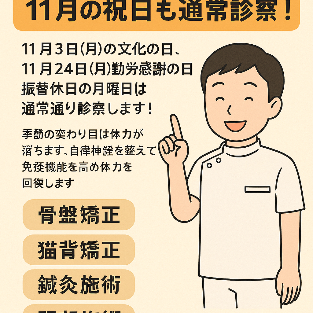 くろちゃん鍼灸整体院では、**11月3日(月・文化の日)と11月24日(月・勤労感謝の日振替休日)**も通常どおり診察しています。