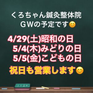 こんにちは! ゴールデンウィークは通常の定休日の 水曜日、日曜日はおやすみ。 4/29土曜日、昭和の日 5/4木曜日、みどりの日 5/5金曜日、こどもの日 祝日ですが営業致します😊 普段ご来院できない方も祝日にお身体の不 […]