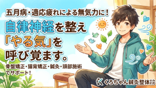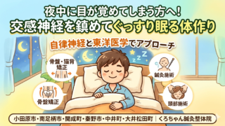 小田原市、南足柄市、開成町、秦野市等で寝つきの悪さにお悩みなら、くろちゃん鍼灸整体院へ。脳の興奮を鎮める鍼灸や頭部施術、骨盤・猫背矯正で自律神経を改善し、根本から眠れる体作りを。週2回からの通院で休まない体を目指しましょう。LINE・HPで24時間受付中!当日予約もまずはご相談を。