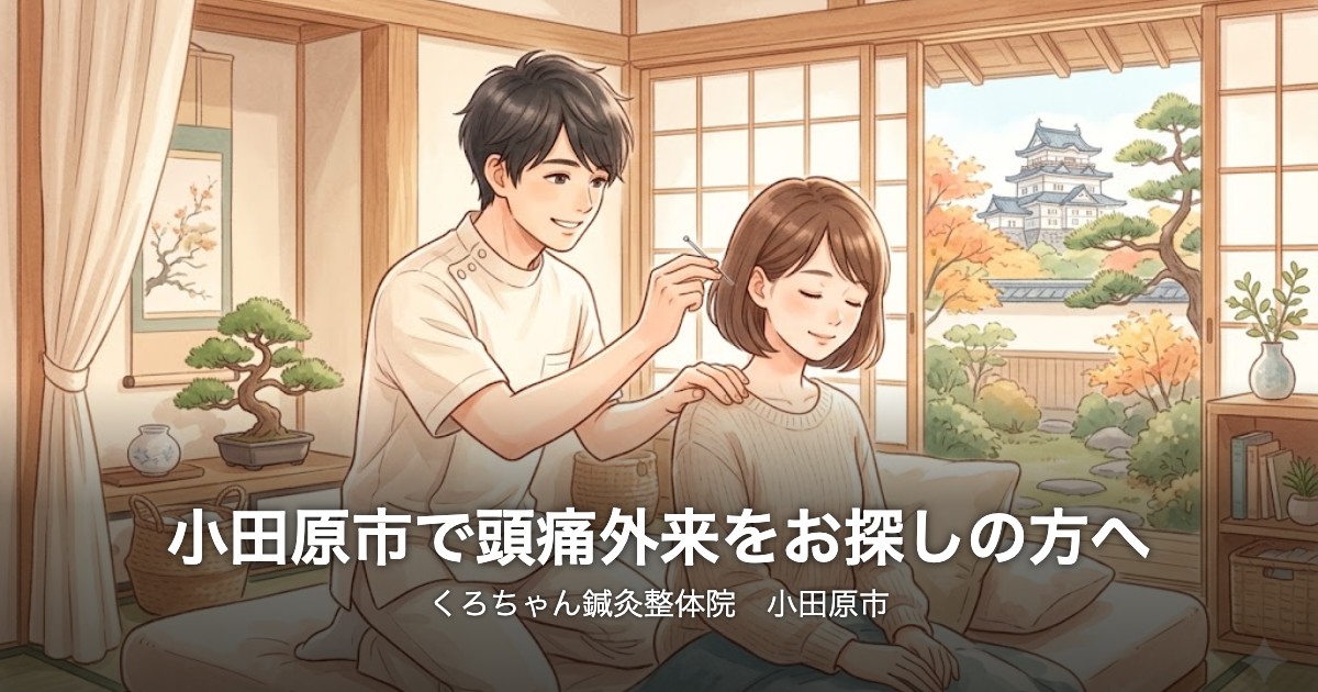 「小田原市で頭痛外来を探しているけれど、できれば薬だけに頼りたくない」「病院で検査をしても異常なしと言われたが、慢性的な頭痛が治らない」——そんなお悩みを抱えて小田原市で鍼灸・整体をお探しの方に向けて、本記事では、頭痛外来と鍼灸整体それぞれの役割、慢性頭痛のタイプ別アプローチ、くろちゃん鍼灸整体院の施術方針、ご自宅でできるセルフケア、よくあるご質問までまとめて解説します。小田原市で慢性頭痛と長く付き合ってきた方に、選択肢のひとつとしてご参考いただければ幸いです。